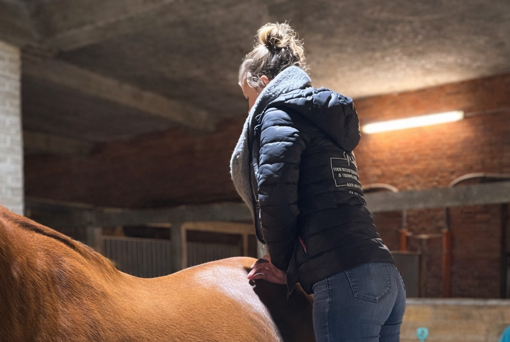 Nach der Anamnese kommt eine kurze Adspektion, in der ich mir das Tier von allen Seiten im Stand anschaue. Hier achte ich auf die Körperform- und Haltung, die Gliedmaßenstellung, Rückenlinie, Kopf- und Halshaltung, sowie auf weitere Auffälligkeiten. Daraufhin mache ich eine Übersichtspalpation und achte hier vor allem auf Temperaturunterschiede. Diese können mir bereits erste Hinweise auf mögliche gestörte Bereiche geben.